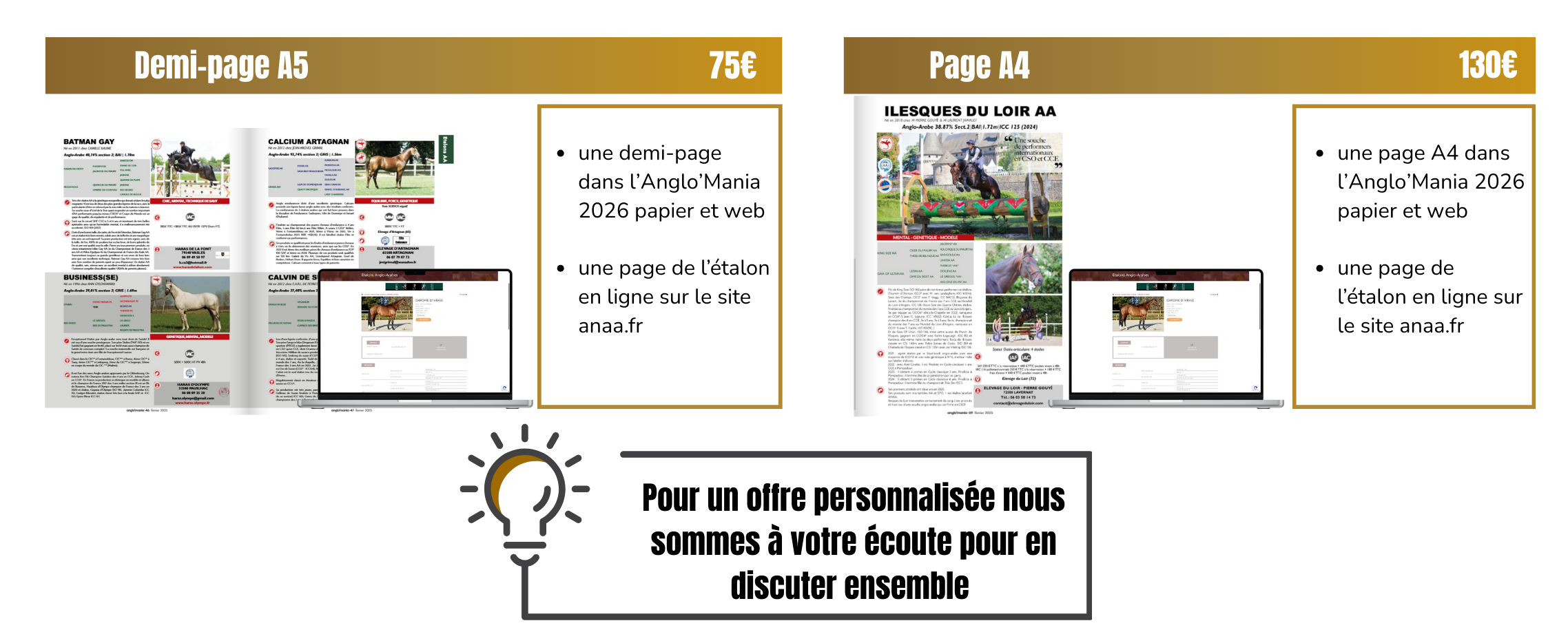 Le prochain numéro de notre magazine Anglo’Mania spécial Étalons 2026 arrive très bientôt ! C’est l’occasion idéale pour mettre votre étalon en valeur de façon informative grâce à une fiche détaillée et à des tarifs avantageux !