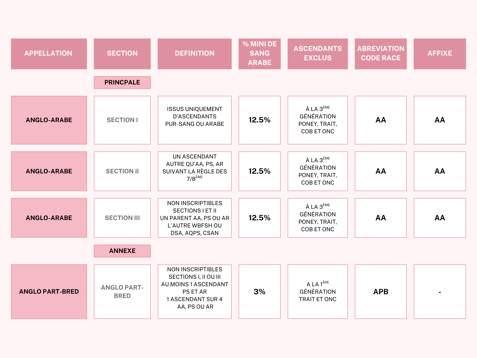 «Sont inscriptibles à l’Anglo part-Bred les produits non inscriptibles dans le livre généalogique français du cheval Anglo-Arabe Section I, II ou III et ayant au moins un ascendant arabe et un ascendant Pur-Sang et dont au moins 1 ascendant sur 4 à la 2ème génération répond soit aux dispositions des sections principales, soit sont inscrits à l’un des livres généalogiques officiellement reconnus par les instances internationales regroupant les livres généalogiques de Pur-Sang, d’Arabe, et d’Anglo-Arabe et admis par la CIAA ou ayant à l’une quelconque des générations précédentes, une proportion équivalente d’auteurs selon les mêmes critères.