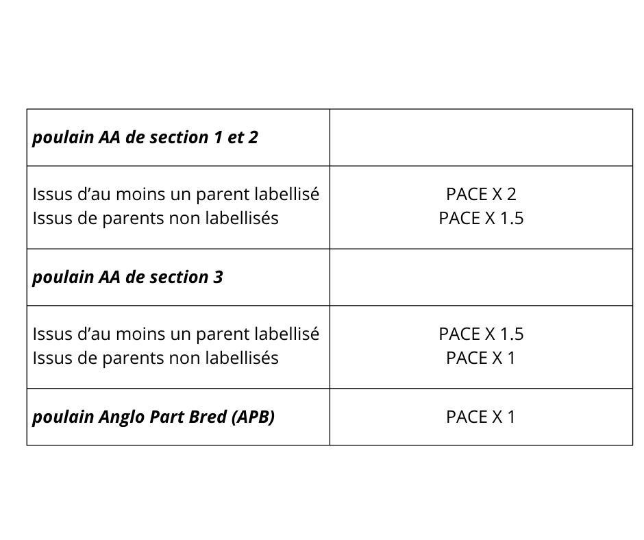 Les juments SPORT ayant des points PACE obtiendront la labellisation sous réserve d’une note moyenne de modèle au moins égale à 14/20 (ou 6.5/10 pour les notes obtenues avant 2026) .